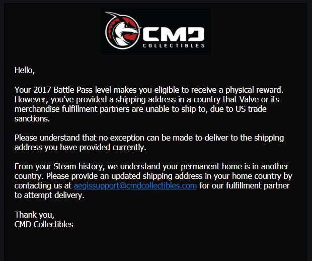 این ایمیل با توضیحاتی همراه بود که در آن صراحتا اشاره شده است، هیچ کدام از آیتمهای فیزیکی مربوط به The International Battle pass 2017 برای خریدارانی که در کشور ایران سکونت دارند، ارسال نمی شود.