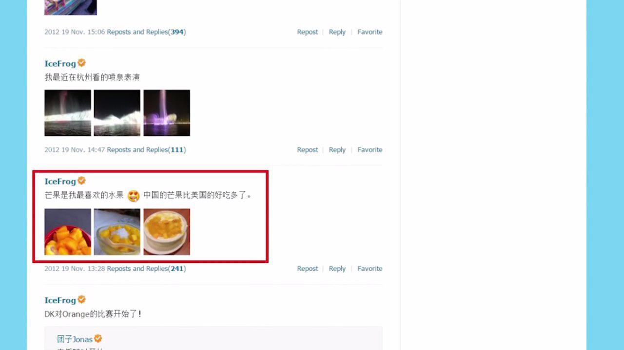سال 2012 عکسی از کاسه پر از منگو به اشتراک میزاره و میگه منگو های چینی خیلی خوشمزه تر از منگو های امریکاست و بار ها به اینکه علاقه زیادی به منگو داره در WEIBO خودش گفته